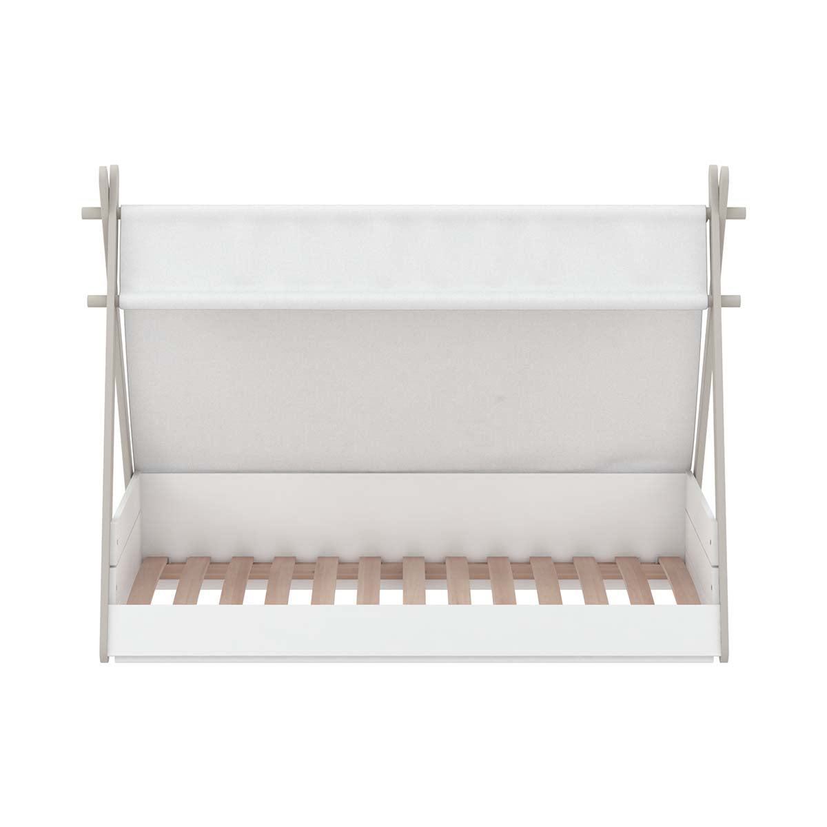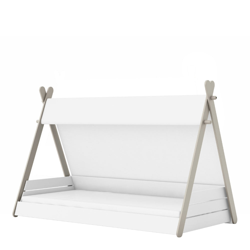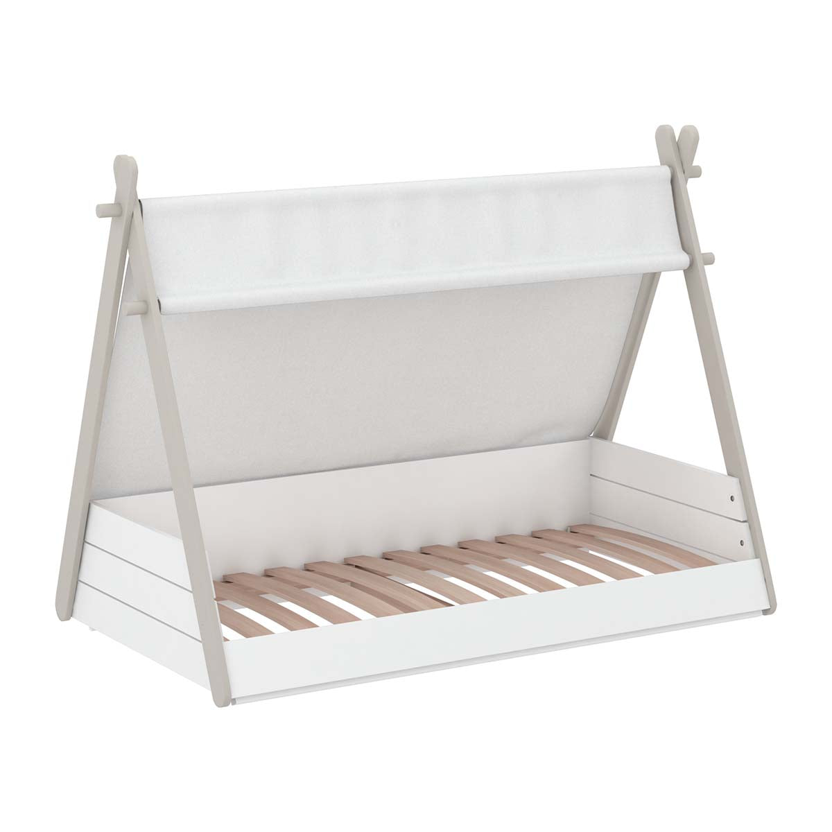 Technische beschrijving: Wit parelmoer/taupe kleur. 90x200cm junior bed. Gordijn in ecru kleur 80% polyester 20% katoen. Verf op waterbasis (veiligheidsnorm). Gelakte MDF structuur. Voldoet aan NF EN 17-25 veiligheidsnormen. Niet geschikt voor kinderen onder de 6 jaar. excl matras.