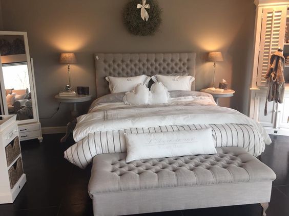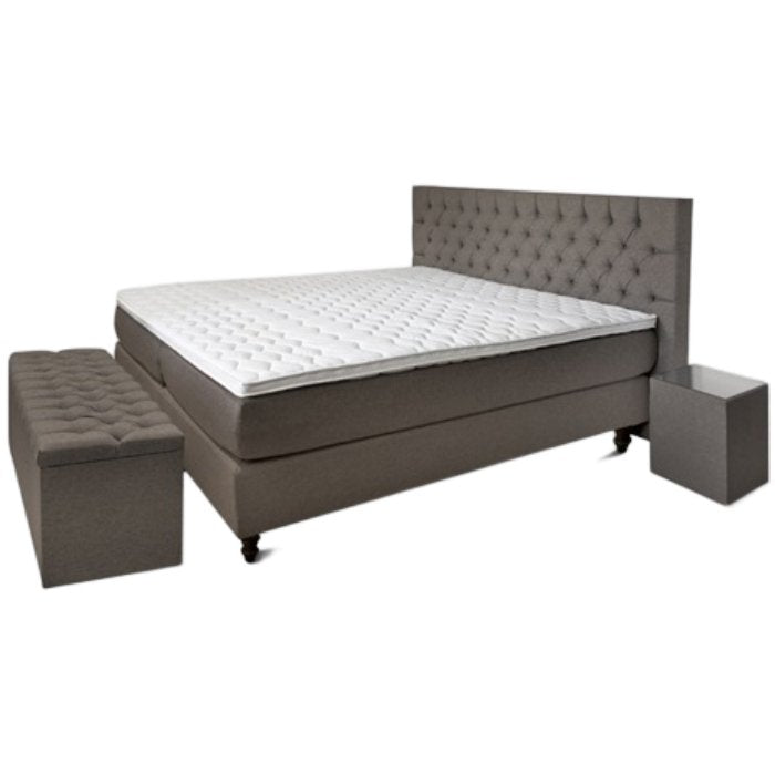 Grijs gestoffeerd tweepersoonsbed met gewatteerd hoofdbord en wit matras, inclusief bijpassende gestoffeerde bank en nachtkastje, geplaatst op een witte achtergrond.