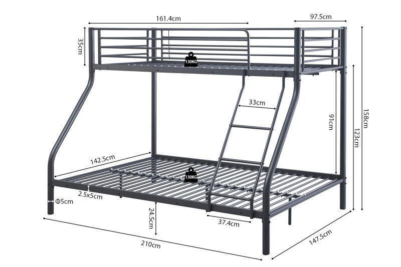 Zwart metalen stapelbedframe met afmetingen en gewichtscapaciteit aangeduid, inclusief een tweepersoonsbed onderaan en een eenpersoonsbed bovenaan, geplaatst op een witte achtergrond.