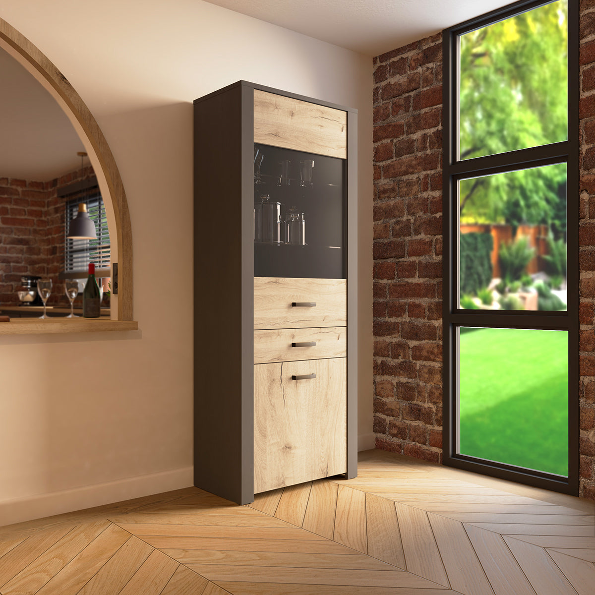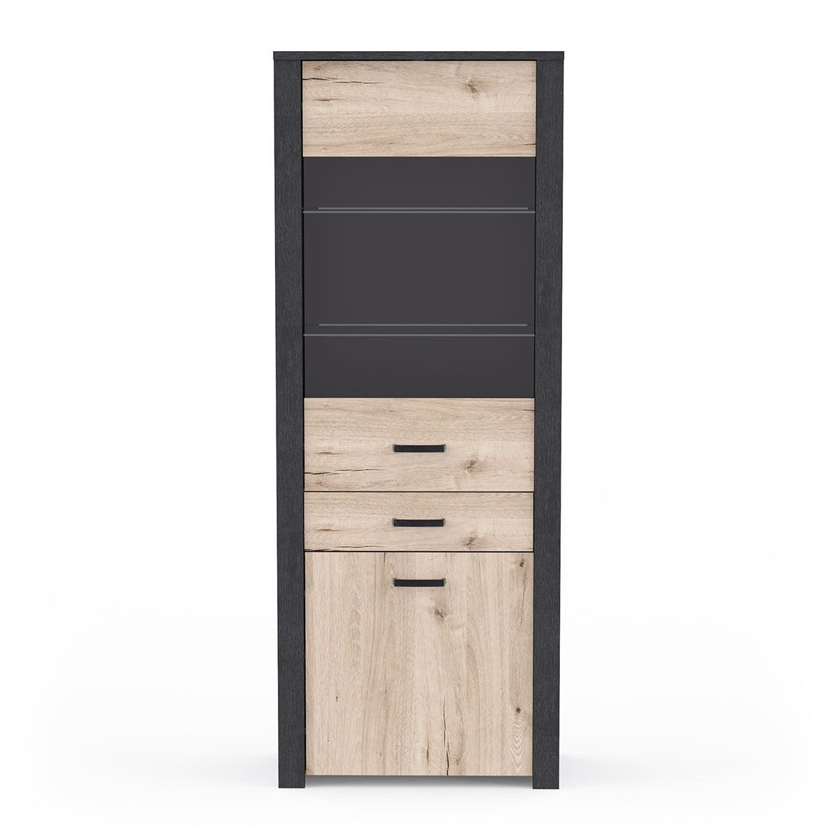 Omschrijving: De Display Cabinet Aubrac is een elegante vitrinekast die warme licht eiken tinten combineert met strakke ebony accenten. Dankzij de transparante deur en glazen legplanken komen decoratieve items, servies of boeken perfect tot hun recht. Onderaan zorgen een gesloten compartiment en een handige lade voor extra opbergruimte voor spullen die je liever uit het zicht houdt. Een ideale mix van stijl en functionaliteit voor woonkamer of eetruimte.