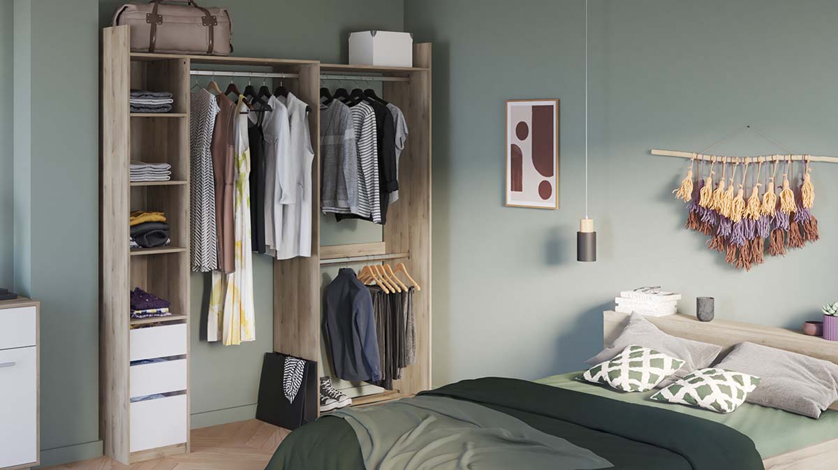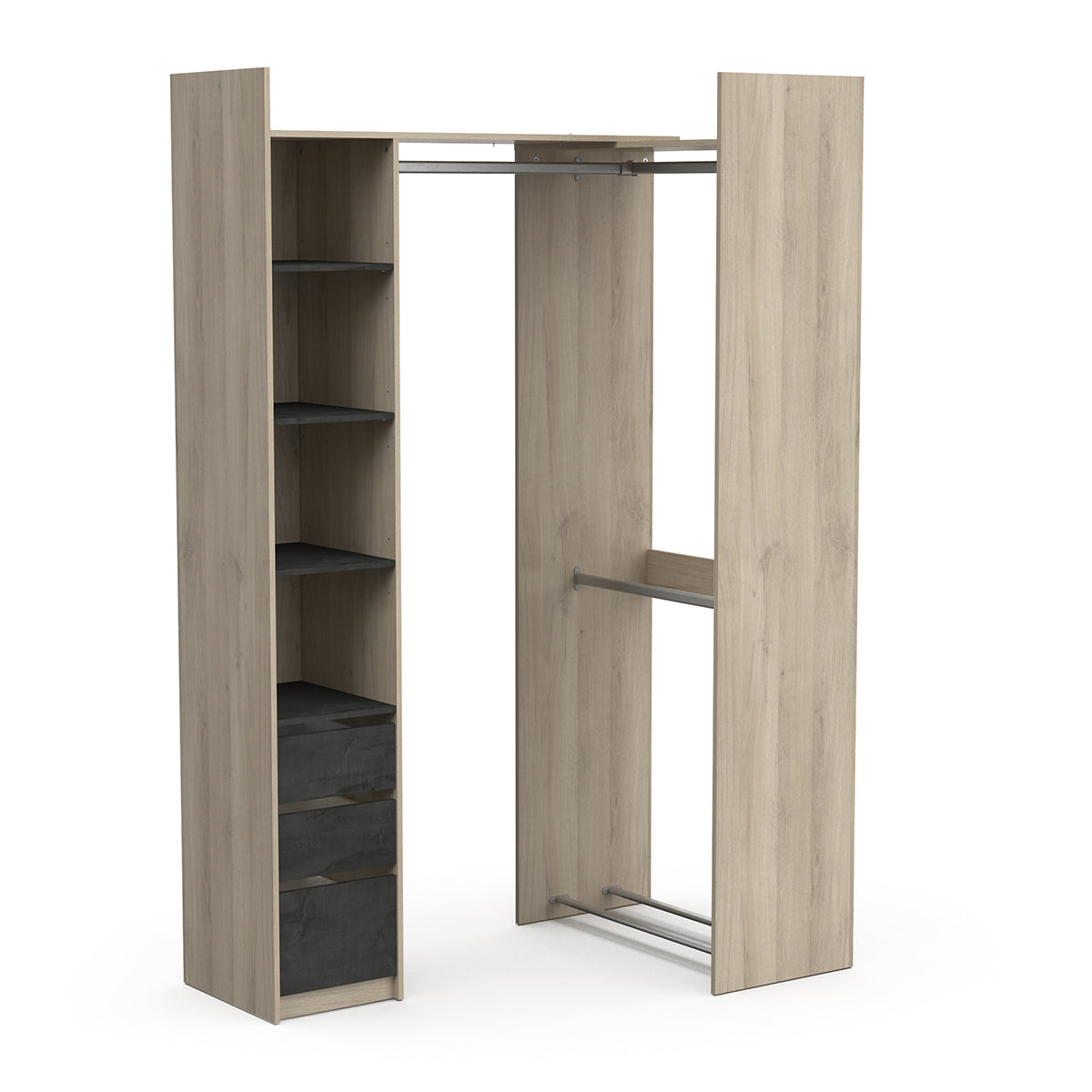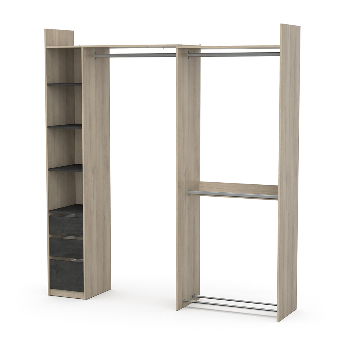 Technische beschrijving: 3 legplanken verstelbaar in 3 hoogtes, afmetingen: 32,5 x 43,6 cm. 1 vaste plank. 2 laden gemonteerd op een paar metalen kogellagergeleiders, afmetingen: 29,2 x 38,7 x 10,6 cm. 1 grote lade, afmetingen: 29,2 x 38,7 x 14,6 cm. 3 kastrails, 79,9 cm lang, voor extra opbergruimte. 1 schoenenrek onderaan met 2 opbergstangen. Handgrepen voor gemakkelijke toegang.