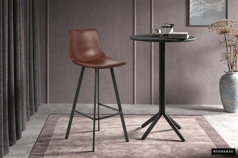 Hoge barkruk met een cognacbruin lederen zitting en een slank zwart metalen frame, perfect voor een stijlvolle keuken- of barinrichting.