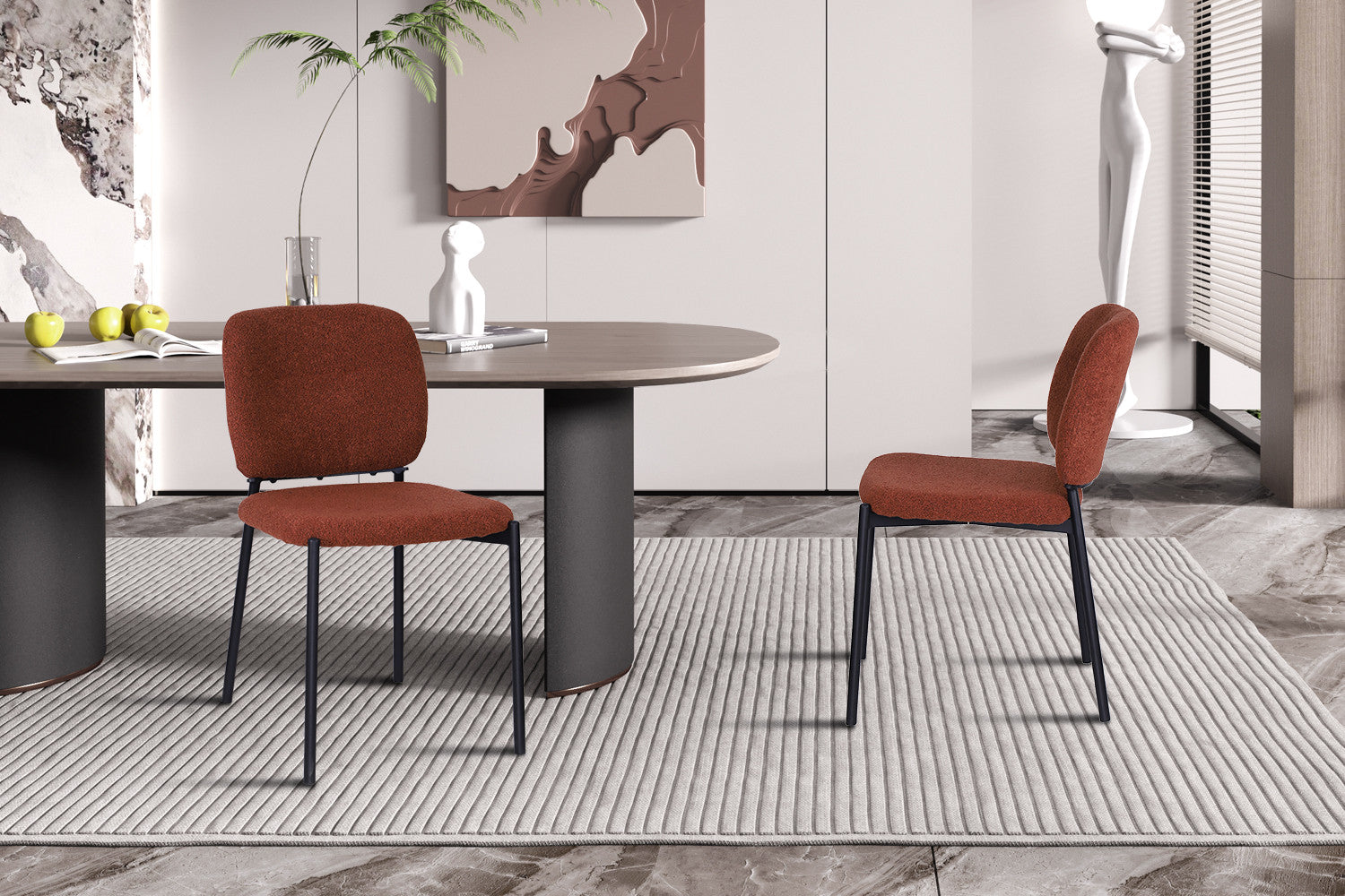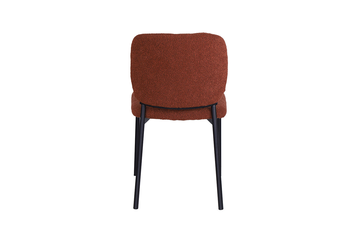 Breng warmte en stijl in je interieur met de ‘Sophia’ stoelen, uitgevoerd in een rijke roestkleurige stof. Het afgeronde design en de slanke metalen poten zorgen voor een elegante uitstraling die perfect past in zowel moderne als klassieke interieurs.