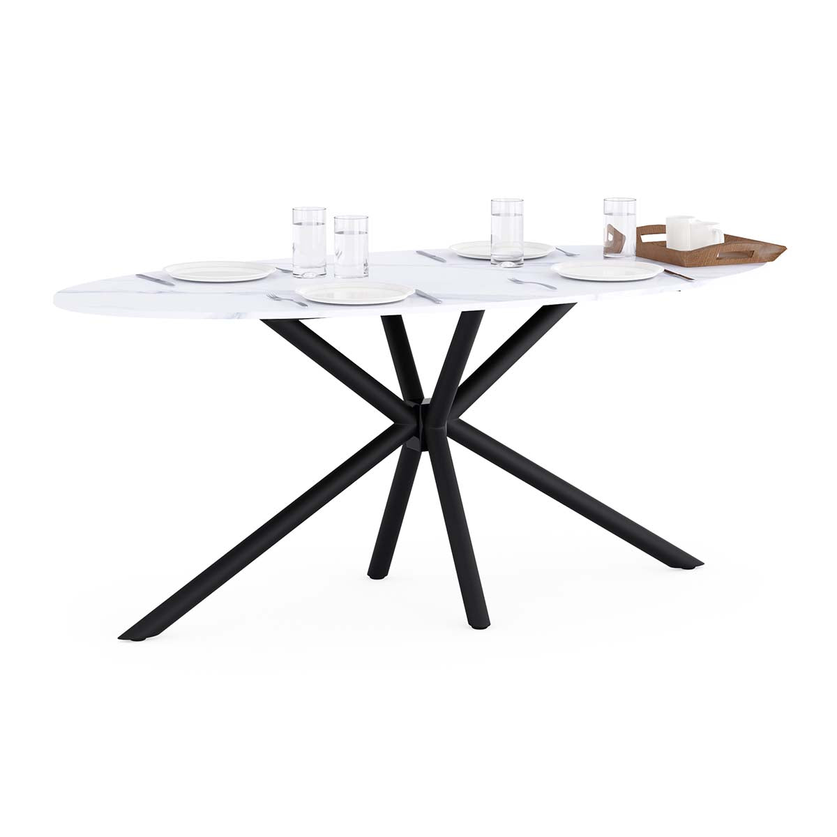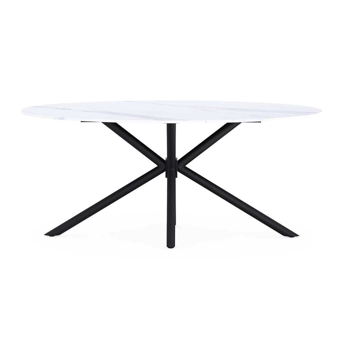 De Tafel Matera is een elegante en tijdloze eettafel die design en gebruiksgemak perfect combineert. Het ovale keramische blad in witte marmerlook zorgt voor een luxueuze uitstraling en is tegelijk bestand tegen krassen, hitte en dagelijks gebruik. De stervormige centrale voet in zwart metaal biedt niet alleen uitstekende stabiliteit, maar geeft de tafel ook een sculpturale look. Geschikt voor 4 tot 8 personen en ideaal voor zowel dagelijkse maaltijden als gezellige diners met gasten.
