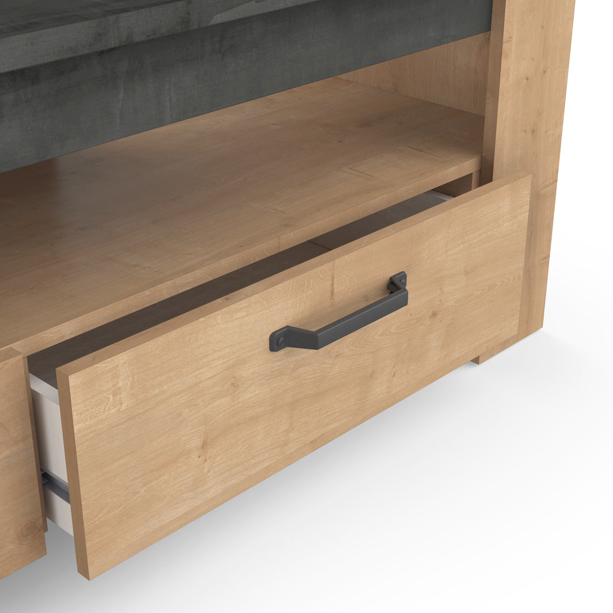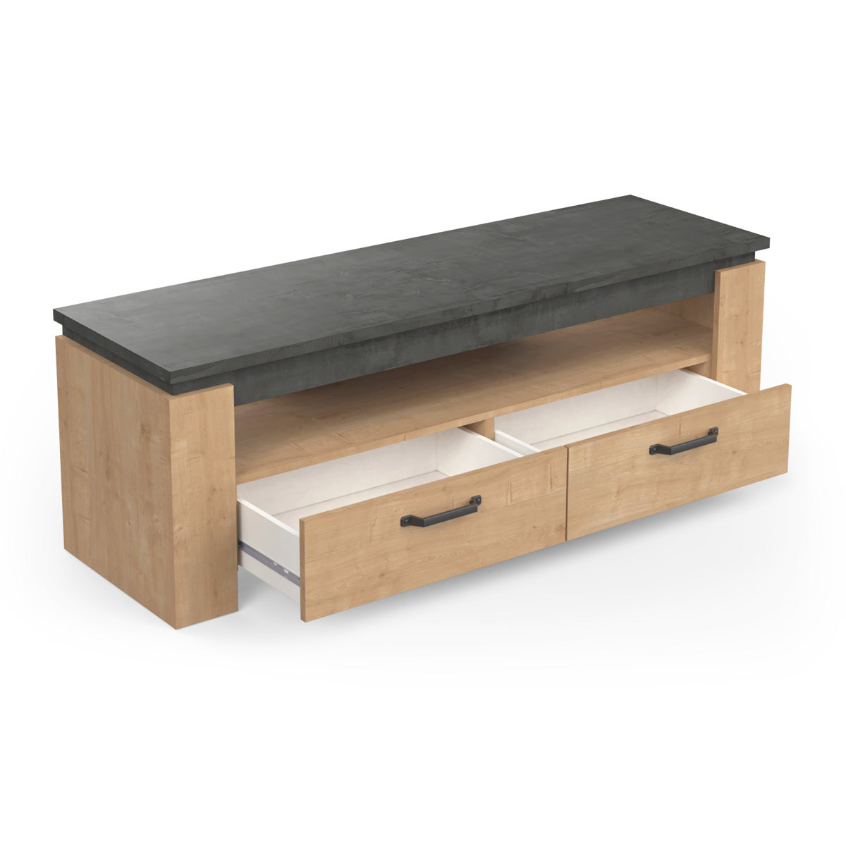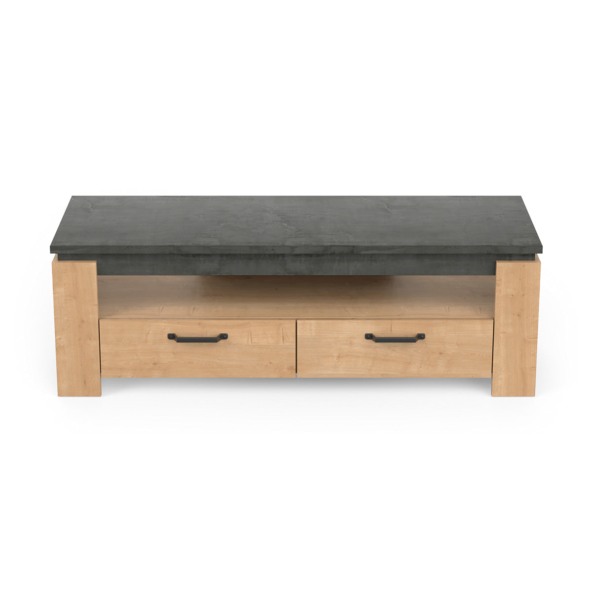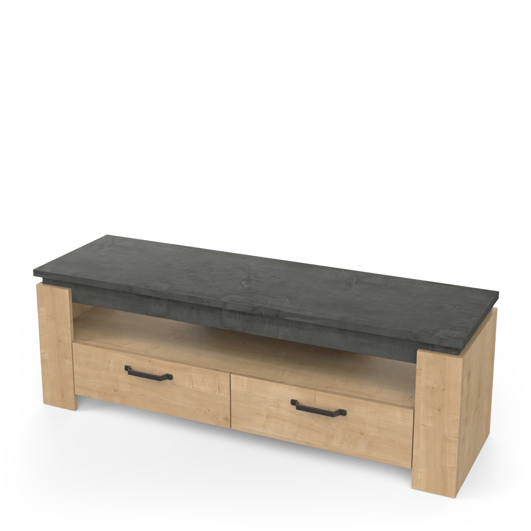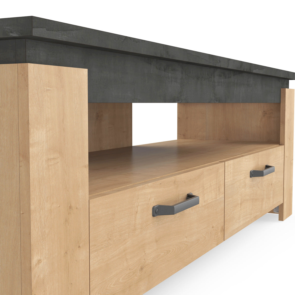Breng karakter en functionaliteit samen in je interieur met het Austin TV-meubel. Dit stijlvolle meubel is geschikt voor tv-schermen tot 55 inch en heeft een robuust design met een dikke bovenplaat van 22 mm en grote profielen voor een stevige uitstraling. Dankzij de twee ruime lades en een open opbergvak biedt het voldoende plek voor multimedia, afstandsbedieningen en decoratie. Het meubel is vervaardigd uit 100% melamine panelen, wat zorgt voor uitstekende waterbestendigheid en langdurige kwaliteit.