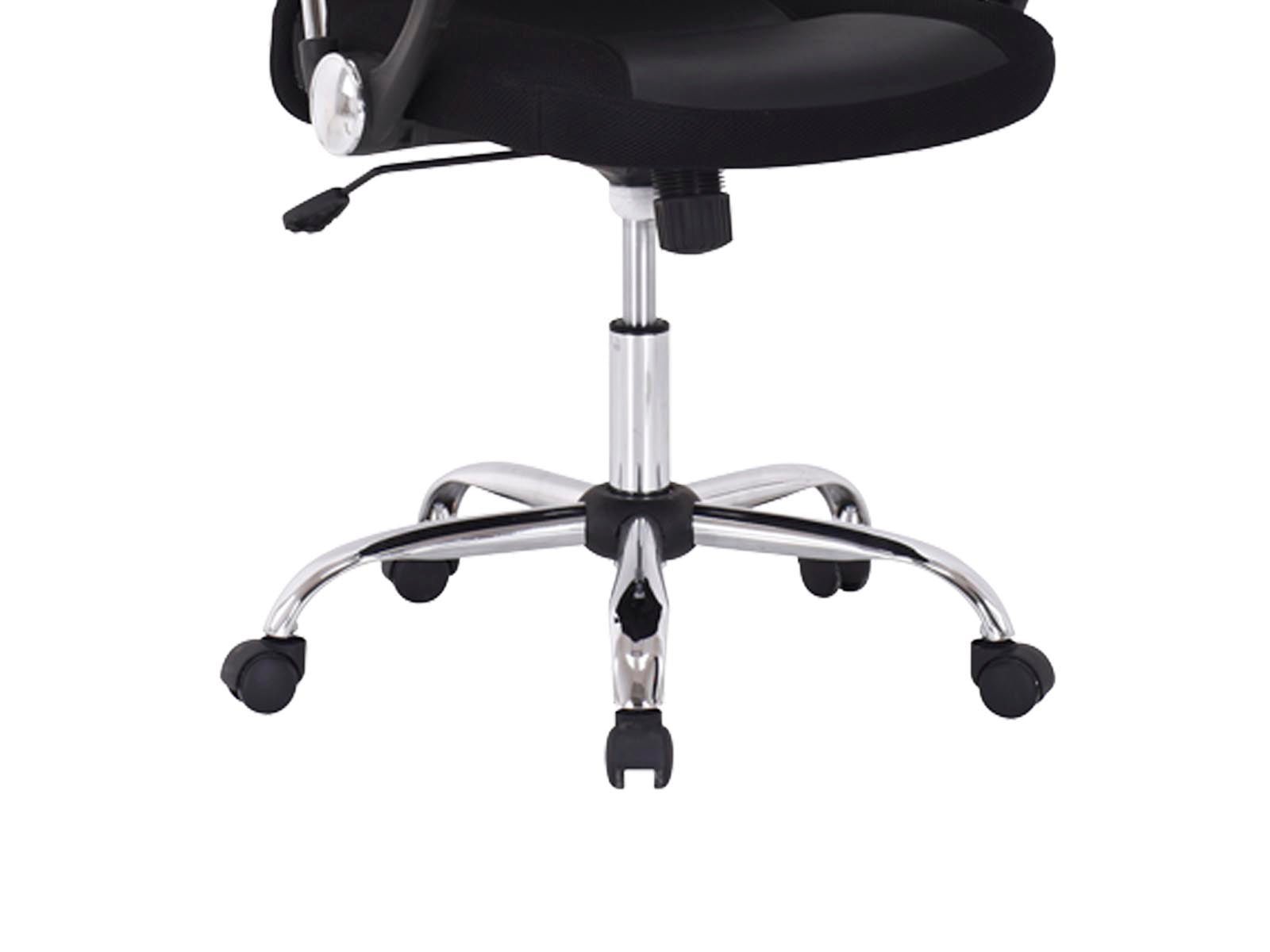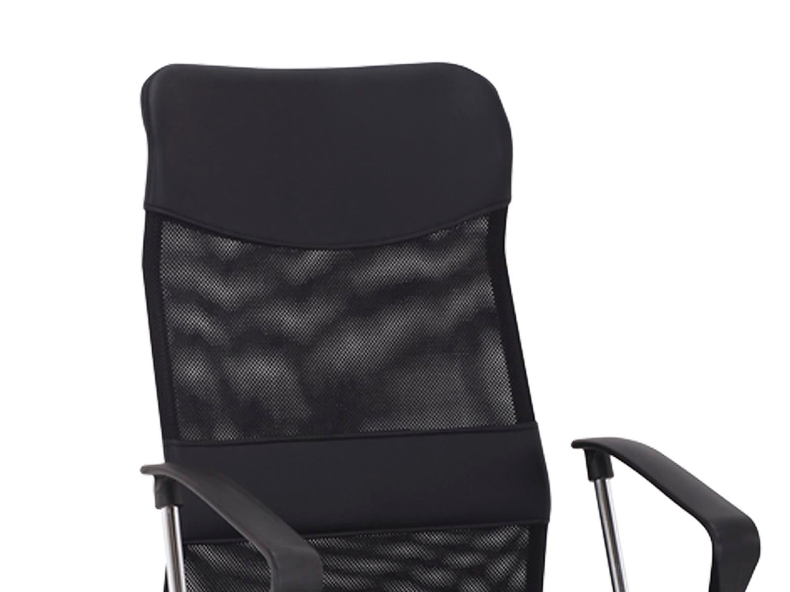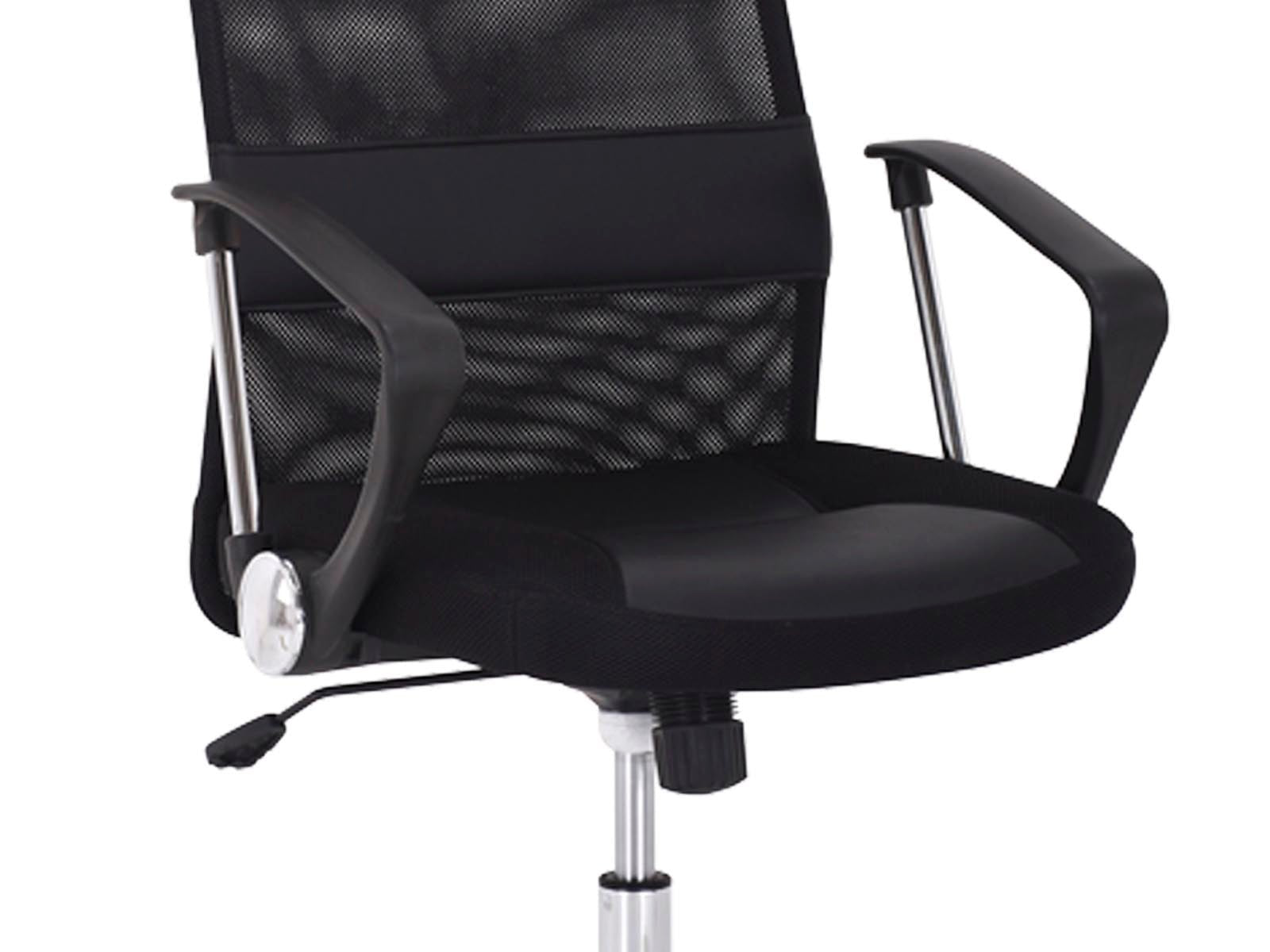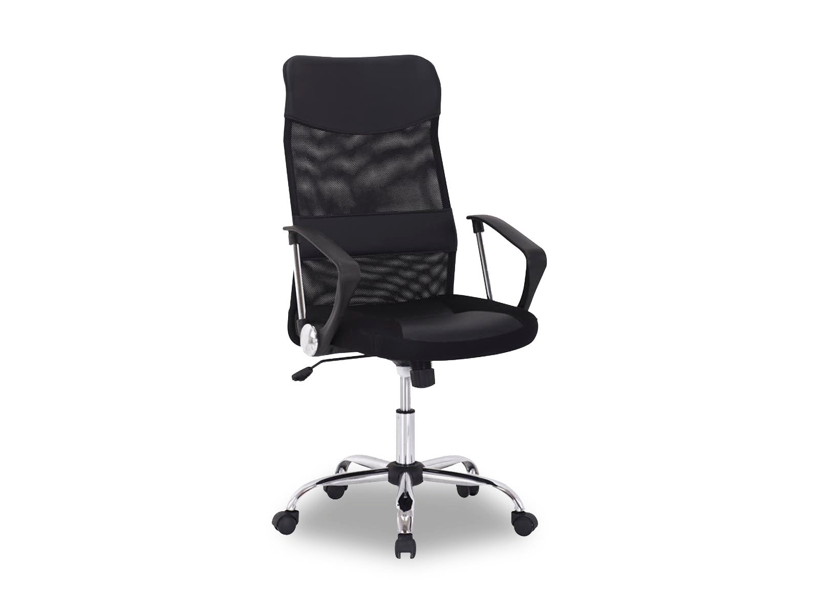 Ergonomische zwarte bureaustoel met mesh rugleuning, verstelbare hoogte en armleuningen. Ideaal voor comfort en ondersteuning tijdens langdurig werken in een kantoor of thuiswerkplek.