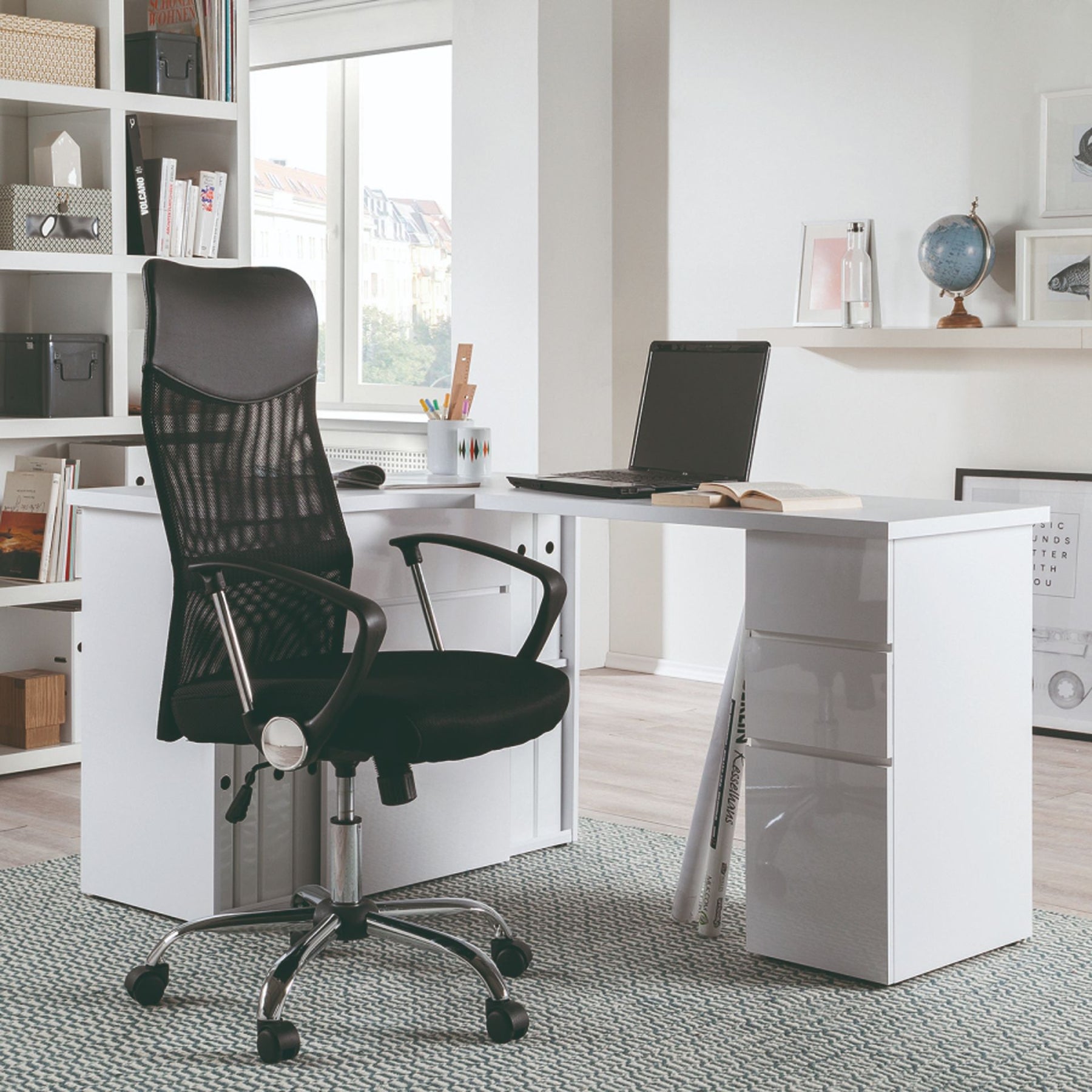 Moderne thuiswerkplek met wit bureau en zwarte ergonomische bureaustoel. Bureau voorzien van lades en ruime werkruimte, ideaal voor kantoor of studeerkamer. Ingericht met boekenplanken en decoraties voor een georganiseerde en productieve werkomgeving.