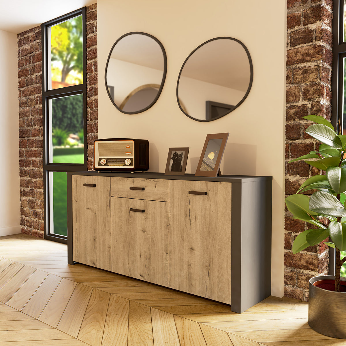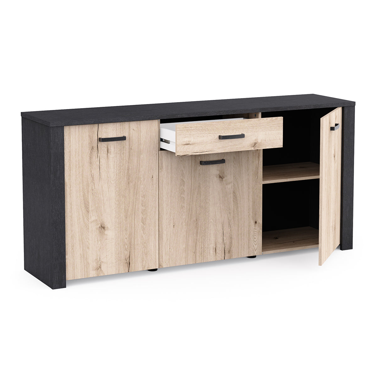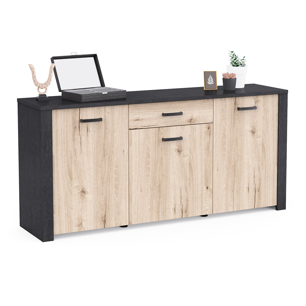 Le buffet Aubrac combine une finition en chêne clair chaleureux avec des accents en ébène contrastés pour un look à la fois caractéristique et intemporel. Les grands compartiments de rangement et les étagères réglables rendent ce buffet particulièrement pratique pour ranger soigneusement de la vaisselle, des livres ou du linge de maison. Les poignées subtiles et grises donnent au meuble une apparence authentique et légèrement rustique, parfaitement adaptée aux intérieurs modernes comme classiques.