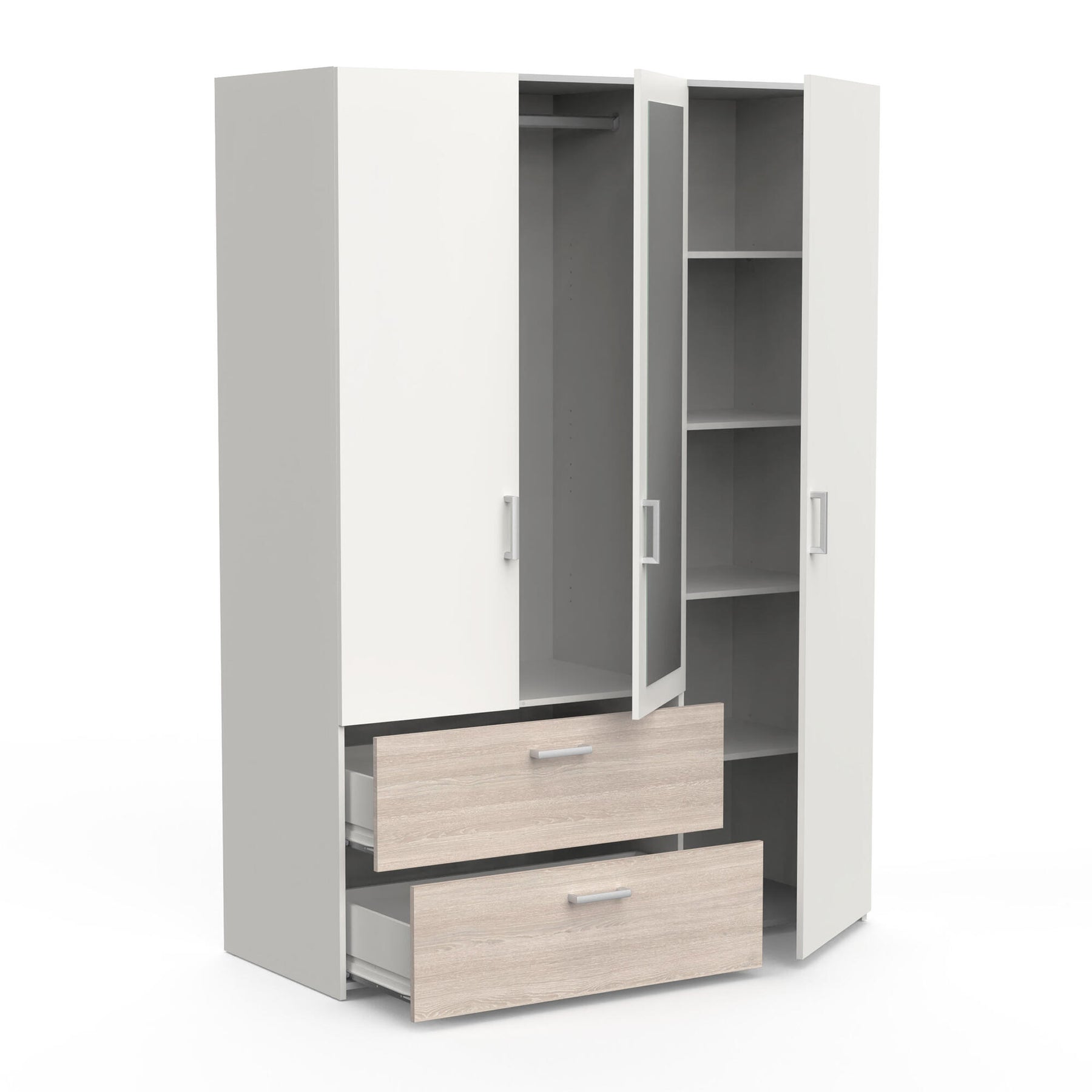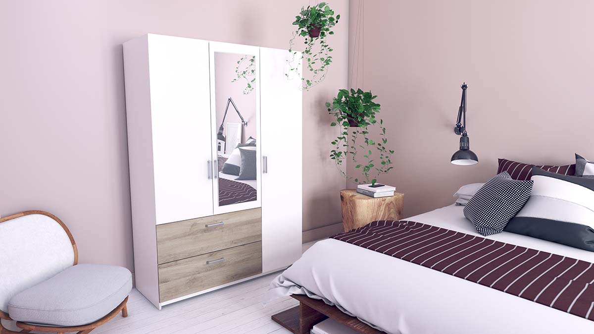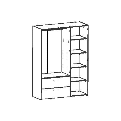 Description technique : Panneau de particules de 15 mm. Décor en papier. 4 étagères, 1 amovible et 3 réglables sur 3 niveaux, dimensions utiles : 43,1 x 49,3 cm. 2 tiroirs, dimensions utiles : 81 x 38,7 x 14,6 cm montés sur 1 paire de roulettes. 1 miroir avec bords biseautés : L 35,1 x H 115,7 cm - épaisseur 3 mm. 1 barre de penderie 85,1 cm - gris. 2 renforts de tiroir. 5 poignées en plastique aluminium grises. Fibre blanche en 3 parties. Feutre adhésif.