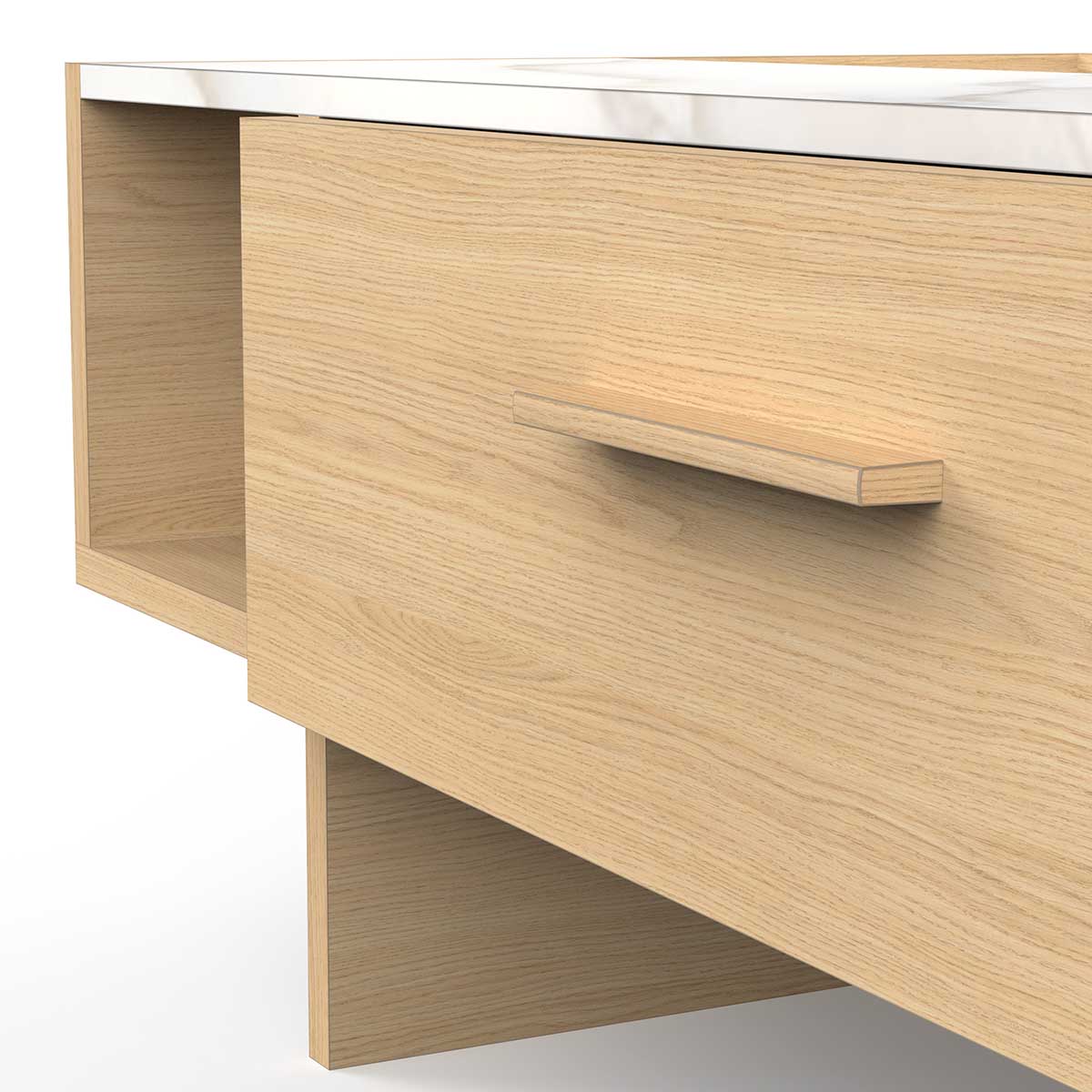 Description : La table basse Stoik combine des teintes claires de chêne avec un élégant aspect marbre blanc pour une apparence raffinée et moderne. Le plateau de table coulissant rend cette table basse non seulement stylée, mais aussi particulièrement pratique grâce à l'espace de rangement supplémentaire qui se cache en dessous. Idéal pour ranger les télécommandes, les magazines ou les accessoires, tandis que le design épuré s'intègre parfaitement dans un intérieur contemporain.
