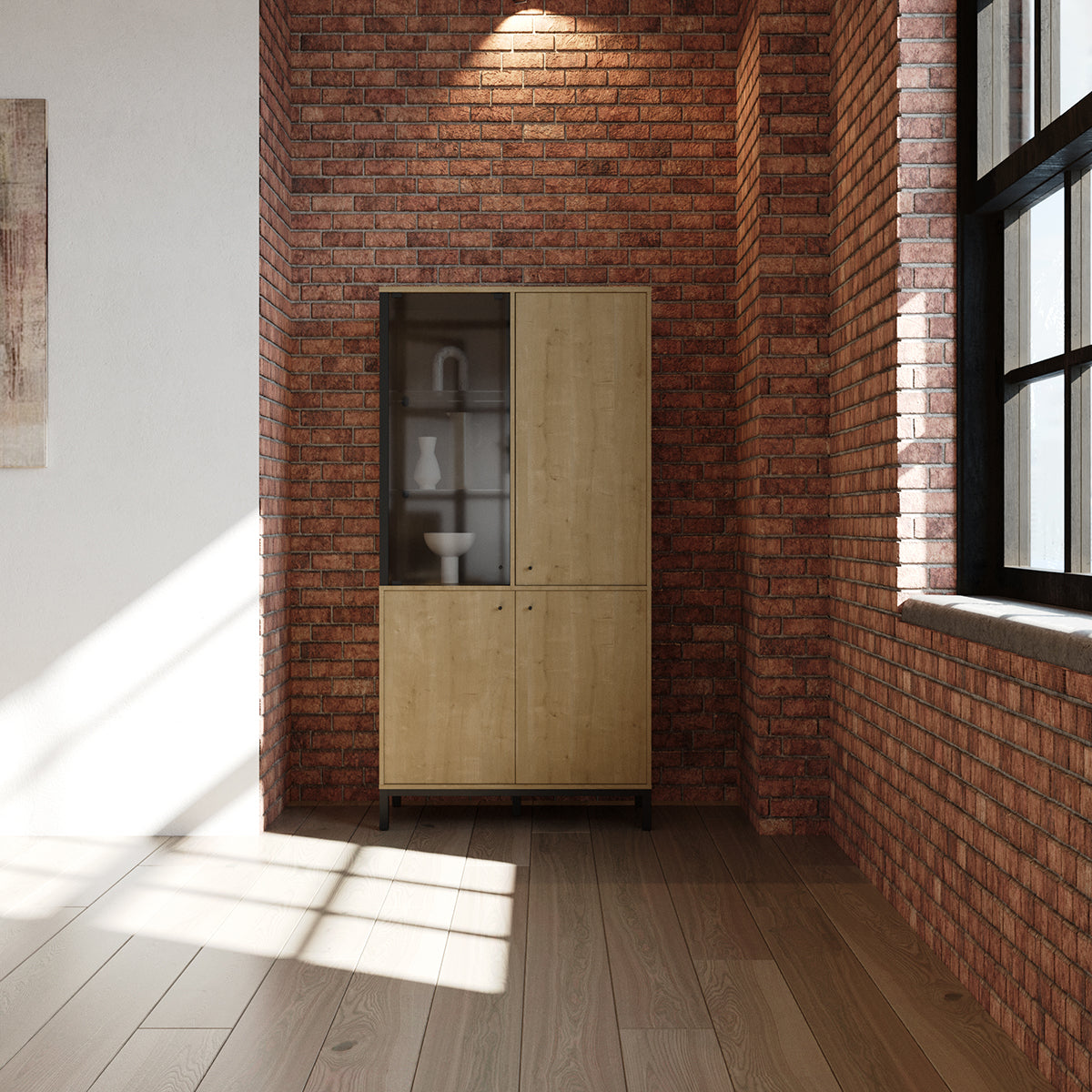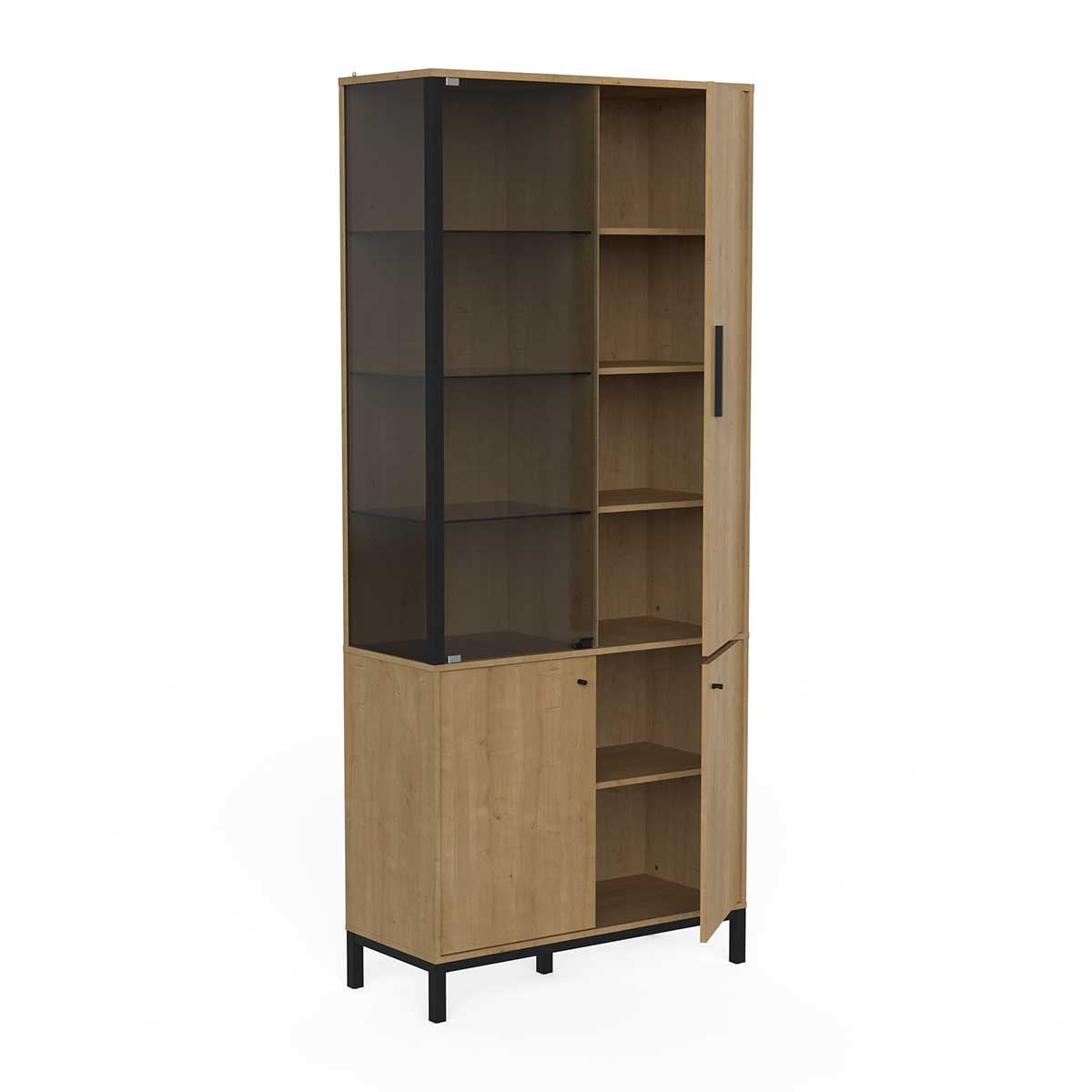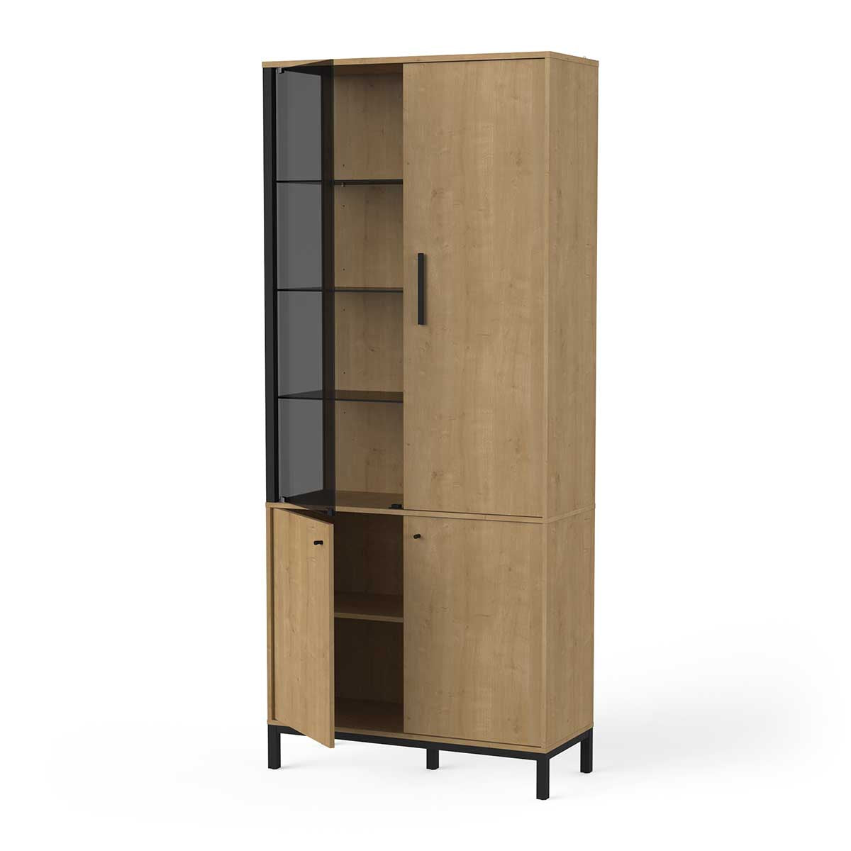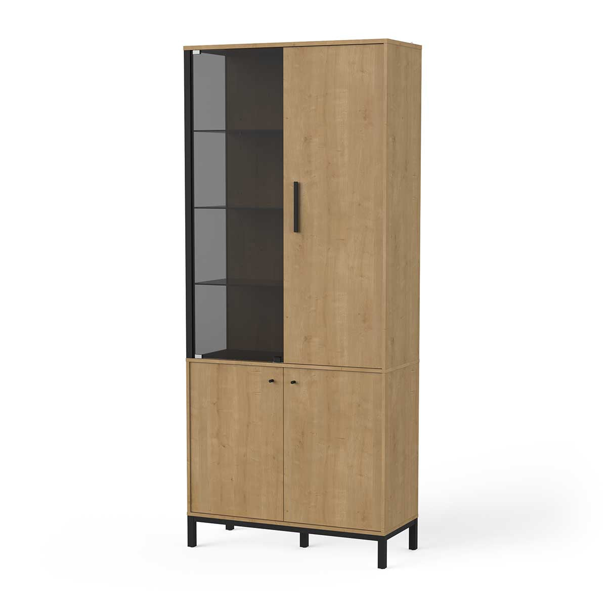 De Craft I vitrinekast combineert een warme houttint met stoere zwarte accenten voor een eigentijdse industriële uitstraling. Dankzij het donkere glas straalt de kast verfijning uit en blijven je items deels uit het zicht, zonder ze volledig te verbergen.